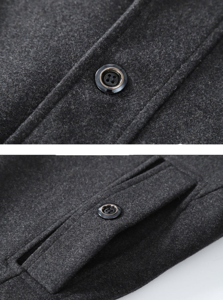 • Design – Dual-layer front, classic lapels, button closure, and detailed cuff accents